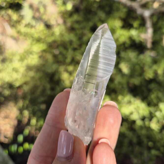 Lemurian Quartz crystals generally come from Brazil. They tend to be super clear, long, and often have a laser-point shape, which makes them look quite striking. One of the key features people use to identify Lemurian Quartz is the presence of horizontal striations, or what some call “barcodes,” along the sides of the crystal. If you can’t quite see the lines, run your fingernail down the crystal—you’ll usually feel little ridges.