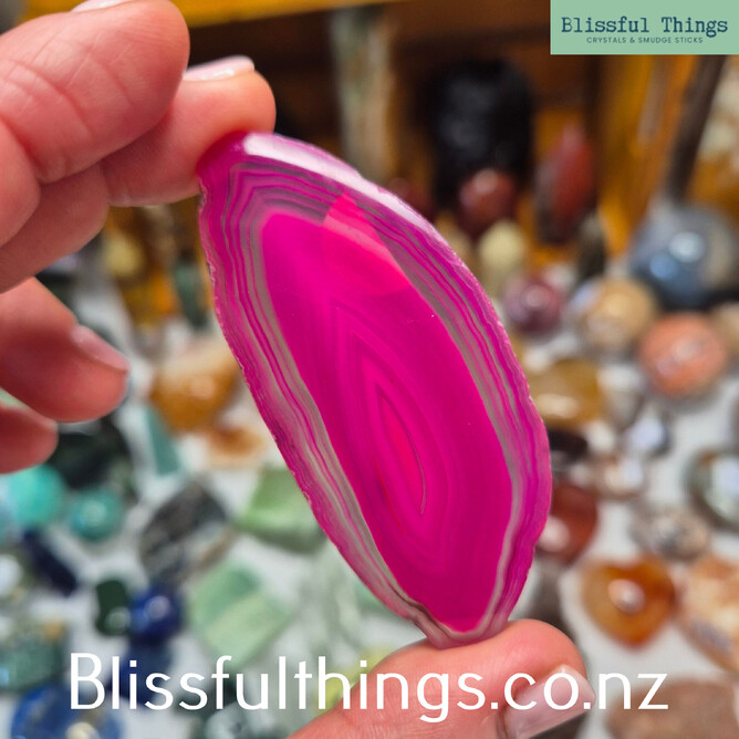 Here at Blissful Things, we appreciate both natural and dyed Agate for their unique appeal. Whether you’re drawn to the soft, natural tones of earth-mined Agate or the dazzling hues of a colour-treated slice, each piece brings beauty and energy in its own way.
