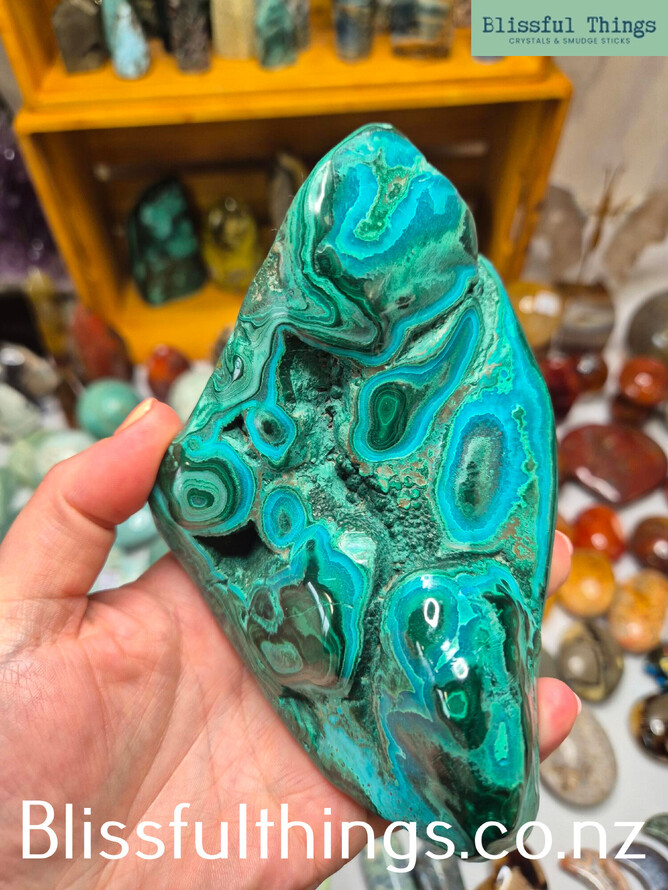 When cut and polished, slices of malacholla reveal stunning bands, waves, and colour blending. These slices are treasured by mineral collectors and energy workers for their beauty and strong heart–throat chakra energies.
