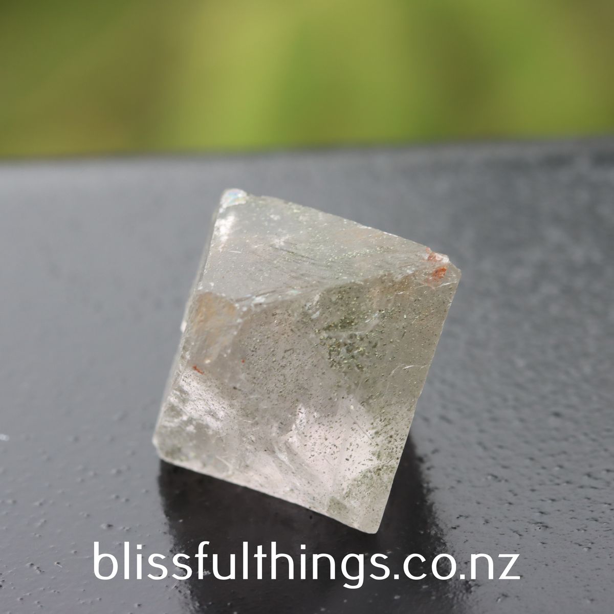 Octahedron refers to the Fluorites natural eight-sided crystal formation. Within this crystal, there is a little Pyrite inclusion. Also, colour can vary, depending what angle you hold the crystal at.