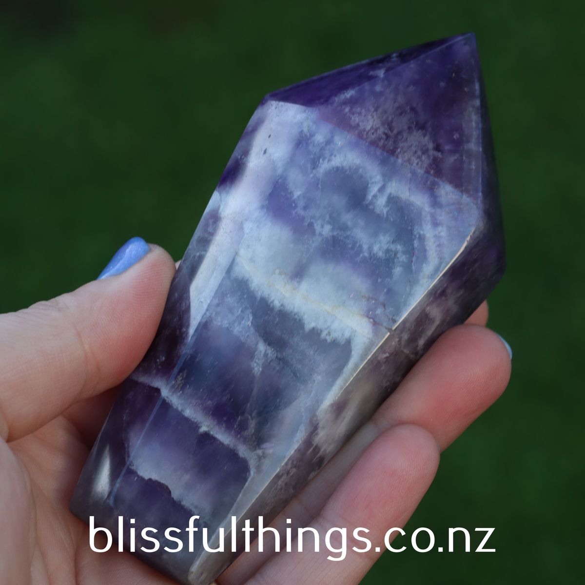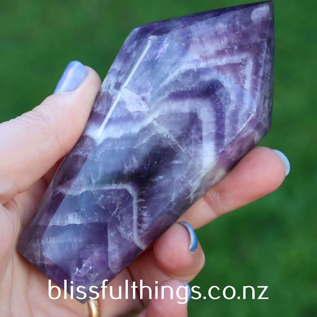 Chevron Amethyst, also known as Dream Amethyst is a striking variety of amethyst that features bands or layers of white quartz and deep purple amethyst, creating a distinctive V-shaped or striped pattern. Scientifically, it is composed of silicon dioxide (SiO₂) and shares the same chemical properties as standard amethyst, with a hardness of 7 on the Mohs scale, making it a durable and beautiful crystal. The unique formation of Chevron Amethyst occurs when amethyst and quartz crystallize together in a layered structure, enhancing both its visual appeal and energetic properties. Metaphysically, this crystal is known for combining the spiritual clarity of amethyst with the amplifying properties of quartz. It is believed to promote intuition, mental focus, and spiritual growth while also offering strong protective and cleansing energies. Many use Chevron Amethyst for meditation, aura cleansing, and stress relief, as it is thought to enhance inner peace, balance emotions, and strengthen one's connection to higher consciousness.