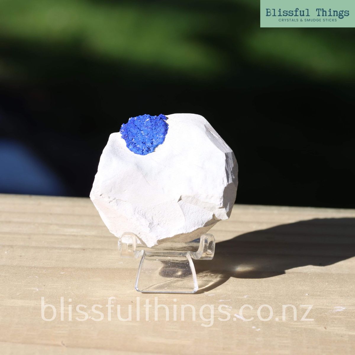 Rare and captivating Azurite Suns, a truly unique formation that stands out in mineral collecting. These extraordinary specimens are known to form exclusively in one location globally, nestled between layers of clay known as Kaolinite. The striking cobalt blue of the Azurite contrasts beautifully with the white Kaolinite, creating a mesmerizing visual effect that is both rare and stunning. Metaphysically, Azurite Suns are celebrated for their powerful energy and spiritual significance. Azurite is renowned for enhancing intuition, mental clarity, and spiritual insight, while its Sun-like formation symbolizes illumination and enlightenment. This rare formation not only serves as a captivating display piece but also as a potent tool for those seeking deeper wisdom and transformative spiritual growth. For any serious mineral enthusiast or spiritual seeker, an Azurite Sun is truly a must-have treasure.