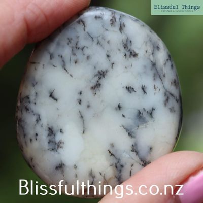 Dendritic Opal, sometimes referred to as Merlinite, is a variety of common opal that contains tree- or fern-like inclusions called dendrites, typically composed of manganese or iron oxides. Unlike precious opal, it lacks a play of color but is prized for its striking, natural patterns that resemble delicate landscapes or ink paintings. Dendritic Opal forms in silica-rich environments and is composed primarily of hydrated silicon dioxide. Metaphysically, it is considered a stone of clarity, growth, and spiritual insight. Often associated with the third eye and crown chakras, Dendritic Opal is believed to enhance intuition, support shadow work, and bring balance during times of transformation. It is also thought to aid in connecting with nature and the subconscious, making it a powerful tool for meditation and personal exploration.