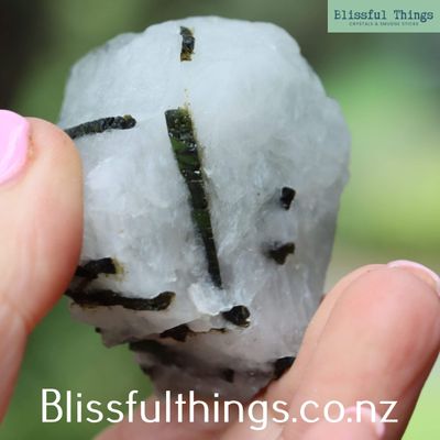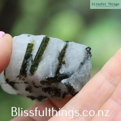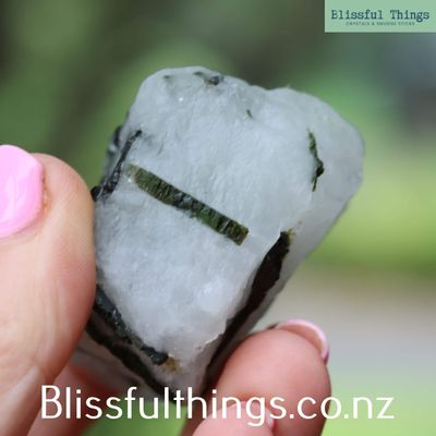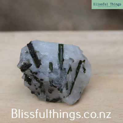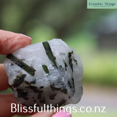 Green Tourmaline in Quartz is a captivating combination of two powerful minerals: green tourmaline, also known as verdelite, and quartz. Scientifically, green tourmaline is a complex borosilicate mineral with the chemical formula Na(Li,Al)₃Al₆(BO₃)₃Si₆O₁₈(OH)₄, and it belongs to the trigonal crystal system. It often forms elongated, prismatic crystals and gains its green coloration from trace elements such as chromium or vanadium. When embedded in quartz—typically clear or milky—the vibrant green inclusions are beautifully highlighted, creating a striking natural contrast. Metaphysically, green tourmaline is known for its strong connection to the heart chakra, promoting emotional healing, compassion, and vitality. It is believed to support balance between the physical and spiritual, encouraging growth, creativity, and the release of negative energy. Quartz, being an amplifier of energy, enhances the metaphysical properties of green tourmaline, making this combination especially powerful for those seeking heart-centered transformation and clarity.