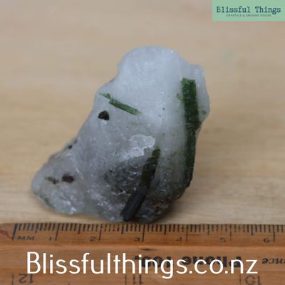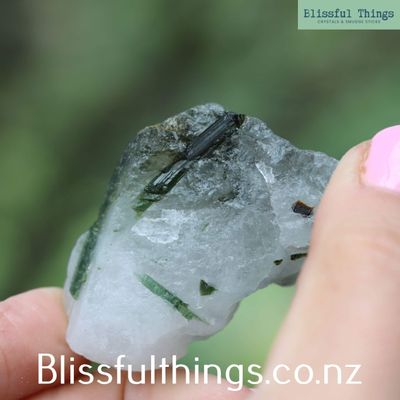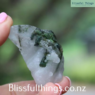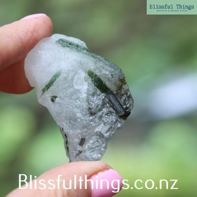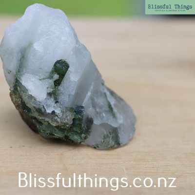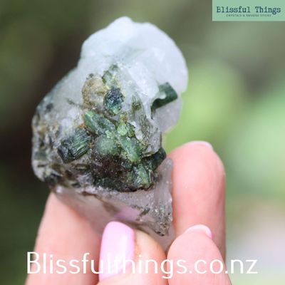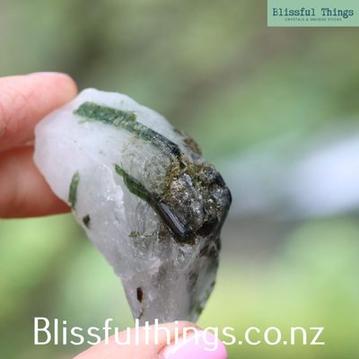 Green Tourmaline in Quartz is a captivating combination of two powerful minerals: green tourmaline, also known as verdelite, and quartz. Scientifically, green tourmaline is a complex borosilicate mineral with the chemical formula Na(Li,Al)₃Al₆(BO₃)₃Si₆O₁₈(OH)₄, and it belongs to the trigonal crystal system. It often forms elongated, prismatic crystals and gains its green coloration from trace elements such as chromium or vanadium. When embedded in quartz—typically clear or milky—the vibrant green inclusions are beautifully highlighted, creating a striking natural contrast. Metaphysically, green tourmaline is known for its strong connection to the heart chakra, promoting emotional healing, compassion, and vitality. It is believed to support balance between the physical and spiritual, encouraging growth, creativity, and the release of negative energy. Quartz, being an amplifier of energy, enhances the metaphysical properties of green tourmaline, making this combination especially powerful for those seeking heart-centered transformation and clarity.