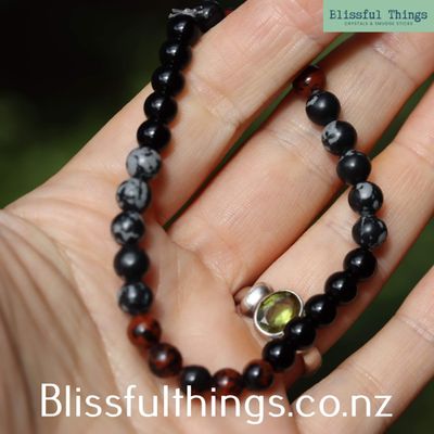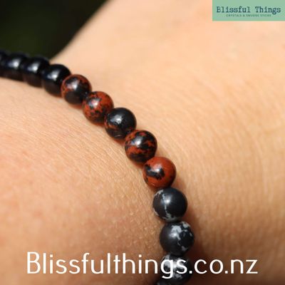This striking bracelet features a powerful trio of Obsidian stones—Black Obsidian, Mahogany Obsidian, and Snowflake Obsidian. These grounding crystals are often associated with cutting energetic ties, releasing negativity, and letting go of what no longer serves you. Whether you’re drawn to their protective and purifying properties or simply love the earthy, volcanic beauty of this combination, this bracelet offers both meaning and style in one wearable piece.