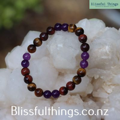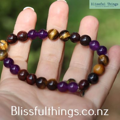 This bold bracelet brings together a powerful trio of stones—Golden Tiger’s Eye, Red Tiger’s Eye, and Amethyst—each associated with courage, confidence, and inner strength. Golden Tiger’s Eye is known for boosting willpower and clarity, Red Tiger’s Eye adds motivation and vitality, while Amethyst offers calm focus and spiritual support. Whether you're seeking an energetic boost or simply love the rich blend of earthy golds, reds, and purples, this bracelet is both empowering and beautifully balanced.