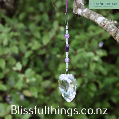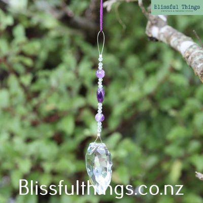 This beautiful suncatcher features a 44mm rainbow-catching sphere paired with Amethyst and Glass beads. Strung on strong tiger tail wire and finished with a complementary embroidery cord.