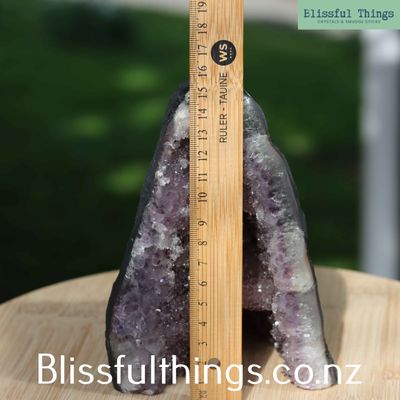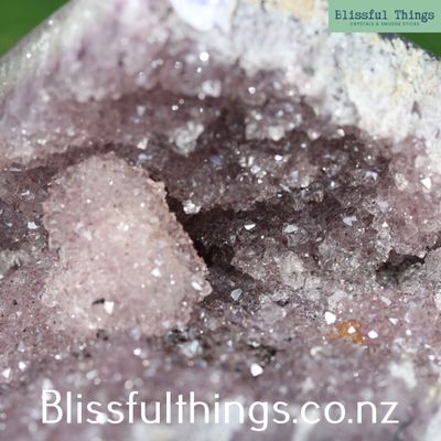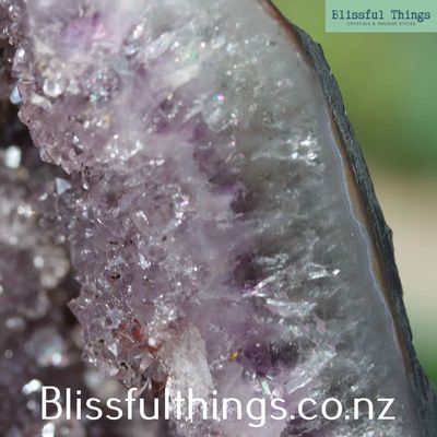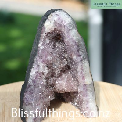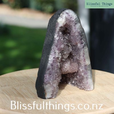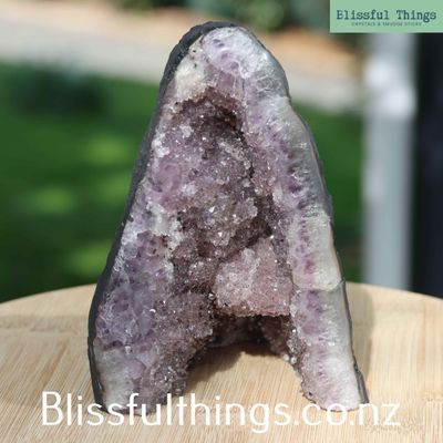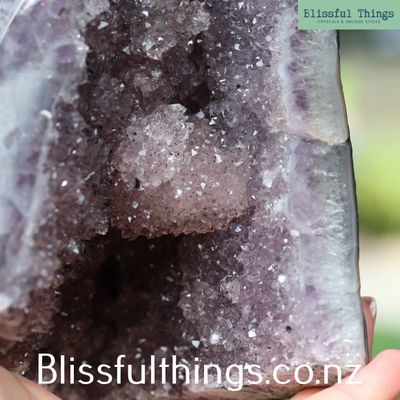 This charming. It features a sparkling drusy surface and a beautiful Amethyst flower formation. Its compact size makes it perfect for smaller spaces, altars, or shelves.