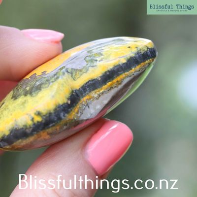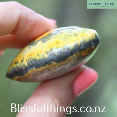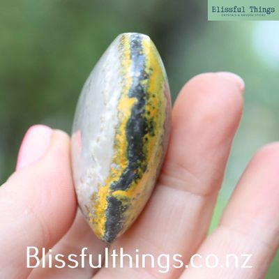Bumblebee Jasper is a striking and vibrant stone that features bright yellow, orange, and black banding, reminiscent of a bumblebee's colours. Scientifically, it is not a true jasper, but a type of volcanic mineral known as * chalcedony* that forms from the combination of sulfur, arsenic, and various volcanic materials. This mineral is typically found in volcanic regions, especially in Indonesia, where it is extracted from the fumaroles of active volcanoes. The unique colour patterns result from the presence of sulfur and other elements, making Bumblebee Jasper both visually stunning and geologically interesting. Metaphysically, Bumblebee Jasper is regarded as a stone of transformation and new beginnings. It is believed to stimulate the solar plexus and sacral chakras, enhancing personal power, creativity, and motivation. Known for its vibrant energy, Bumblebee Jasper is thought to activate one's inner drive, helping to overcome obstacles and break through periods of stagnation. It is often used to encourage a positive outlook, boost confidence, and inspire change. Additionally, some believe it offers protection against negative energies, grounding the wearer while helping them to embrace personal growth and self-expression. However, due to its composition, it should be handled with care, as it can contain toxic elements like arsenic.