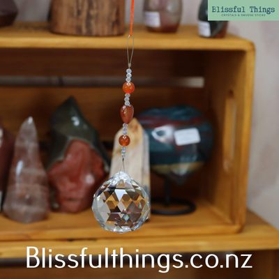 This beautiful suncatcher features a 40mm rainbow-catching sphere paired with Carnelian and glass beads. Strung on strong tiger tail wire and finished with a complementary embroidery cord.