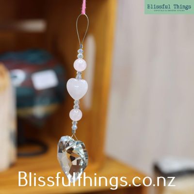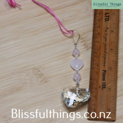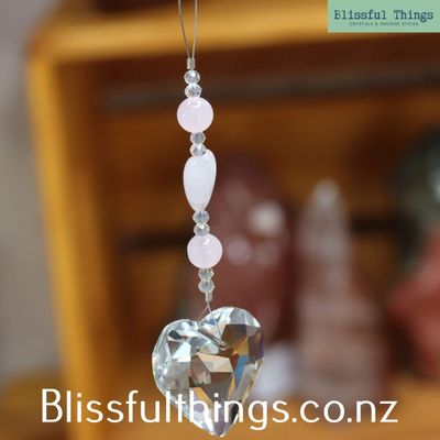 This beautiful suncatcher features a 29mm rainbow-catching Heart paired with Rose Quartz and Glass beads. Strung on strong tiger tail wire and finished with a complementary embroidery cord.