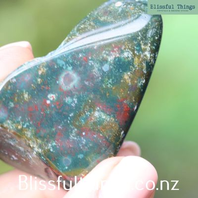 Bloodstone, also known as Heliotrope, is a variety of cryptocrystalline quartz—specifically a form of chalcedony—that is typically dark green with distinctive red or brownish-red speckles caused by iron oxide inclusions, such as hematite. Scientifically, it is composed of silicon dioxide and forms through the deposition of silica from groundwater in cavities or cracks, often in volcanic rocks. The red spots, which resemble drops of blood, inspired the stone’s historical and mystical name. Metaphysically, Bloodstone is known as a stone of courage, vitality, and protection. It is associated with the root and heart chakras, believed to strengthen physical endurance, purify the blood, and promote resilience during times of challenge. Traditionally used by warriors and healers, it is said to enhance decision-making, clear confusion, and ground spiritual energies into the body, offering both strength and stability.