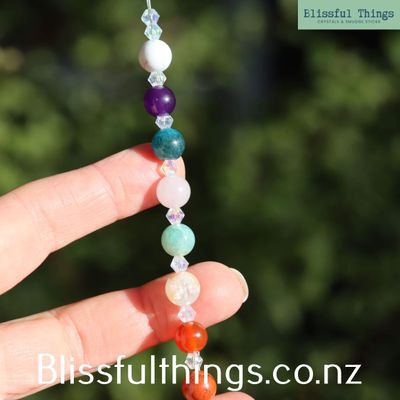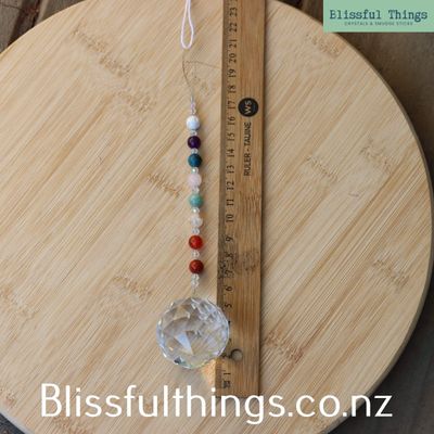This beautiful suncatcher features a 40mm rainbow-catching sphere paired with chakra stone beads. Strung on strong tiger tail wire and finished with a complementary embroidery cord.