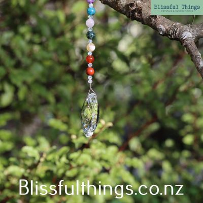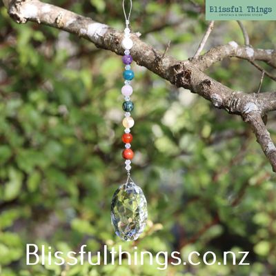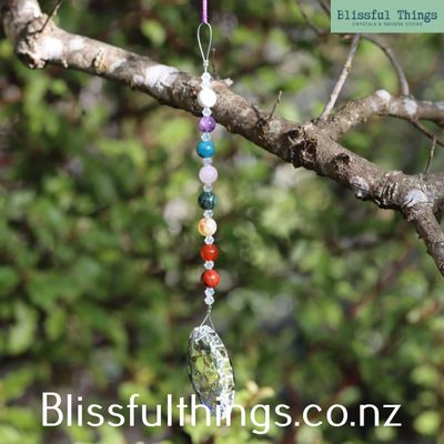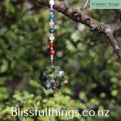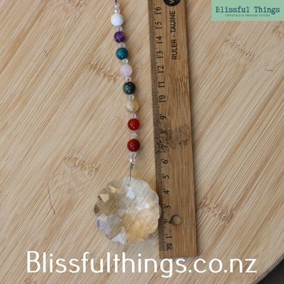 This beautiful suncatcher features a 40mm rainbow-catching Flower paired with chakra stone beads. Strung on strong tiger tail wire and finished with a complementary embroidery cord.