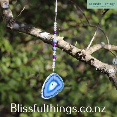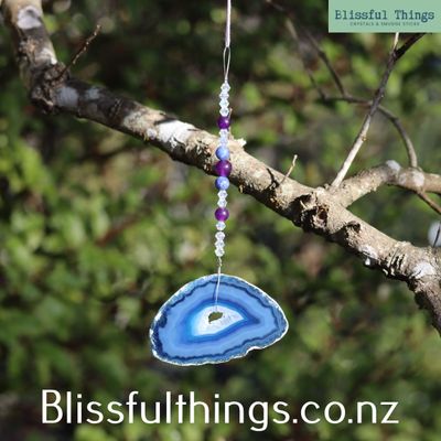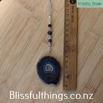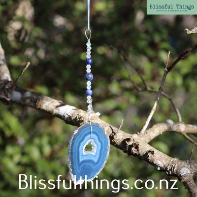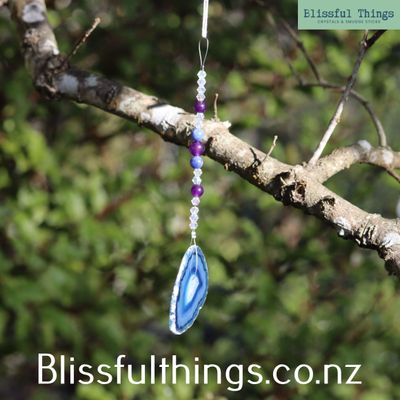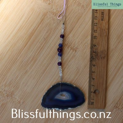 This beautiful hanger is handmade at Blissful Things HQ, featuring a striking blue dyed agate slice paired with sodalite and amethyst beads, along with delicate glass beads for extra sparkle. Each piece is carefully strung on strong tiger tail wire and finished with intricate embroidered thread, making it both durable and unique.