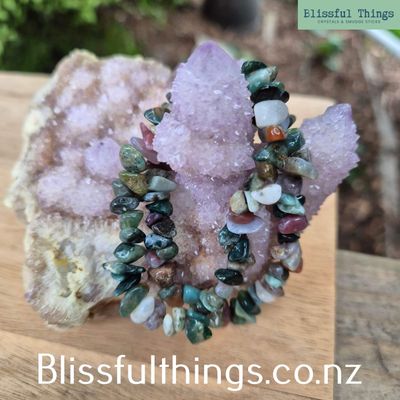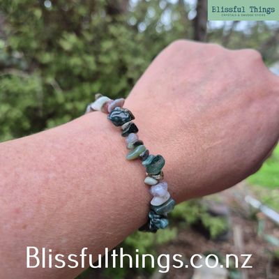 Price is for one Moss Agate Chip Bracelet as shown in the photo and will be similar to what is in the photo. Standard size.