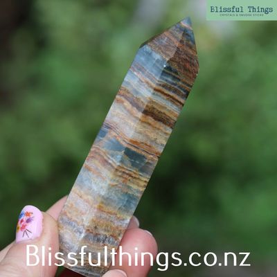 Blue Onyx, also known in metaphysical circles as Lemurian Aquatine Calcite, is a visually striking stone that typically displays soothing layers of ocean blue, teal, and soft grey. Scientifically, it is a form of banded calcite—a calcium carbonate mineral (CaCO₃)—though it is not a true onyx, which is a variety of chalcedony. Its layered structure and calming coloration have led to its trade name. Metaphysically, this stone is associated with emotional healing, intuition, and spiritual connection. It resonates strongly with the throat and third eye chakras, encouraging clear communication, deep inner reflection, and access to ancient or subconscious wisdom. Often used in meditation, dreamwork, or during periods of emotional transition, Blue Onyx is believed to carry a gentle yet profound energy that supports peace, insight, and higher understanding.