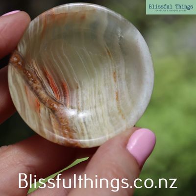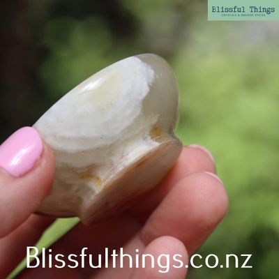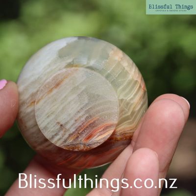 Banded calcite, also marketed as onyx, is a striking variety of the mineral calcite, characterised by its distinct, layered bands of varying colours, typically white, orange, yellow, brown, and sometimes even green.  The bands in banded calcite are a result of different mineral impurities or variations in crystal growth conditions over time. Metaphysically, banded calcite is considered a powerful stone for emotional healing and balance. Each color band is believed to correspond with specific energies—orange and yellow bands are said to support creativity, vitality, and self-confidence. In contrast, white or clear bands are thought to bring clarity and purification. This stone is also known for its ability to calm stress and promote a sense of inner peace, making it a popular tool in meditation and energy healing practices. Banded calcite is often used to clear stagnant energy and foster a sense of renewal, providing a gentle yet effective way to restore harmony to both the mind and the environment.