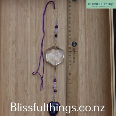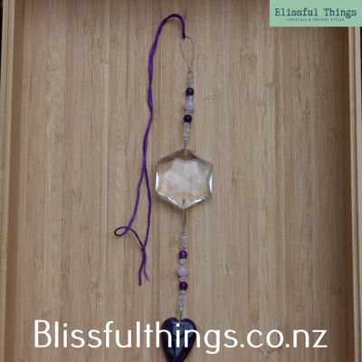 This beautiful rainbow catcher features an octagon crystal drop adorned with a Amethyst heart, creating a radiant display of light and colour.