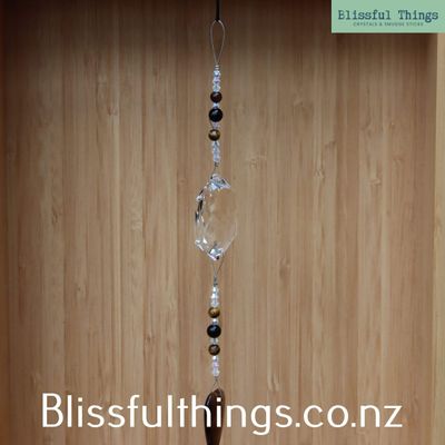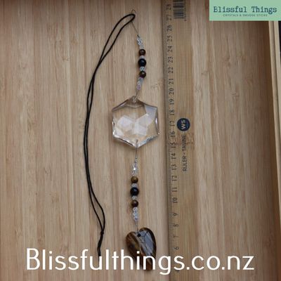 This beautiful rainbow catcher features an octagon crystal drop adorned with a Tiger's eye heart, creating a radiant display of light and colour.