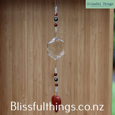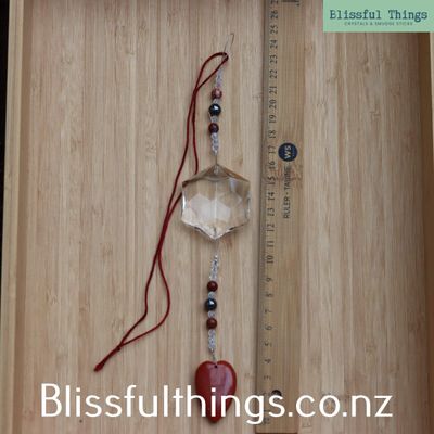 This beautiful rainbow catcher features an octagon crystal drop adorned with a Red Jasper heart, creating a radiant display of light and colour.
