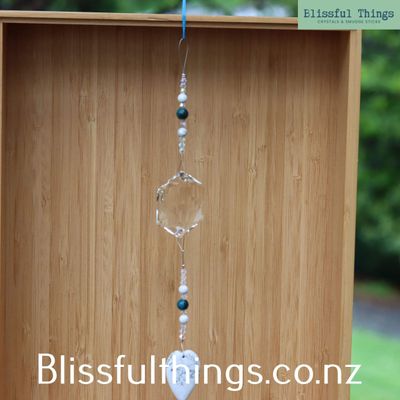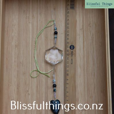 This beautiful rainbow catcher features an octagon crystal drop adorned with a Moss Agate heart, creating a radiant display of light and colour.