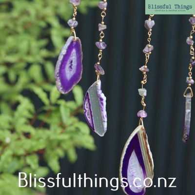 Hoop 15.5cm in diameter. Length from the top of the hoop to the bottom of the Dyed Agate Stones is 46cm. The fabric toggle at the top can be adjusted.