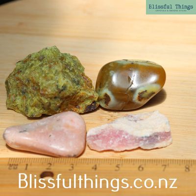 Green Opal Raw & Tumbled, Pink Opal Raw & Tumbled.