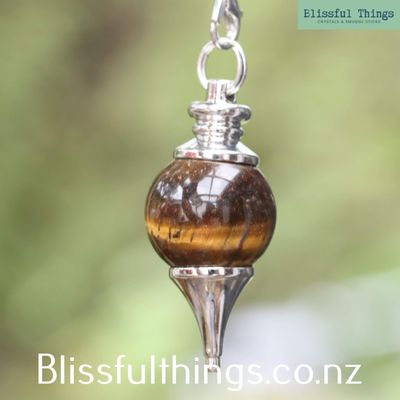 Tigers eye Sphere Pendulum, including a complementary black velvet pouch and basic instructions.