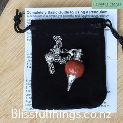 Red Jasper Sphere Pendulum, including a complementary black velvet pouch and basic instructions.