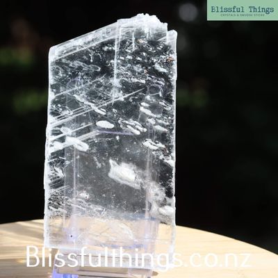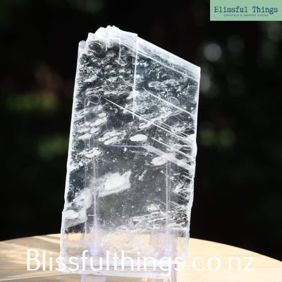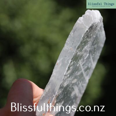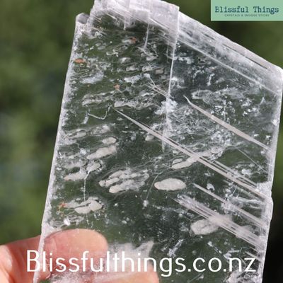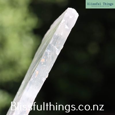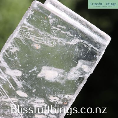 Window Selenite or Clear Selenite is a translucent variety of gypsum, composed of calcium sulfate dihydrate (CaSO₄·2H₂O). It forms in long striated blades, and is known for its softness—ranking only 2 on the Mohs scale. Selenite should never be cleansed with water as it may weaken the structure.