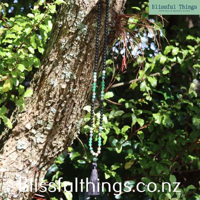 A Mala bead necklace is a traditional strand of 108 beads used for meditation, prayer, and mindful intention. Originating from spiritual practices in regions such as India and Nepal, malas are commonly used to count mantras, breaths, or affirmations during meditation. Each bead is moved through the fingers as a mantra or intention is repeated, helping the mind stay focused and calm. Today, mala beads are often made from natural materials such as wood, seeds, or crystals and are used both as meditation tools and meaningful spiritual jewellery.