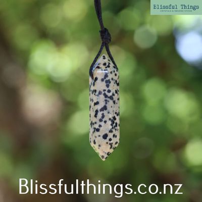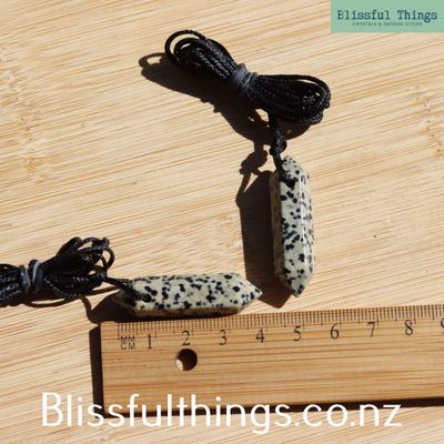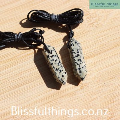 Dalmatian Jasper double-terminated pendant on a complementary black cord.