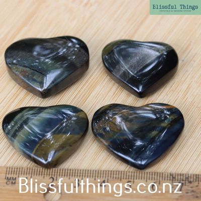 Blue Tiger’s Eye, also known as Hawk’s Eye, is a member of the quartz family and a pseudomorph of crocidolite, where fibrous asbestos-like minerals have been replaced by silica while retaining the original fibrous structure. This gives the stone its distinctive silky chatoyancy — a shimmering, reflective effect that appears to move across the surface. Its deep blue to blue-grey tones are due to natural iron staining and oxidation processes. On the Mohs scale, it has a hardness of about 6.5 to 7, making it durable for jewellery and ornamental use. Metaphysically, Blue Tiger’s Eye is associated with calm focus, inner vision, and clear communication. It is believed to soothe stress, enhance intuition, and open the throat and third eye chakras, encouraging clarity in thought and speech. Often used for calming overactive minds, it is thought to help balance emotional energy while maintaining a strong, grounded presence.
