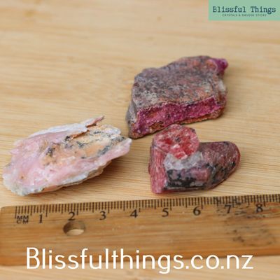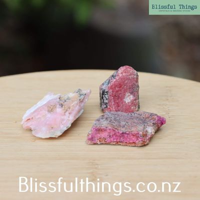 Cobaltian Calcite is known for its vibrant pink colour caused by traces of cobalt within the calcite structure. Pink Opal is an amorphous form of hydrated silica, often valued for its gentle colour and soft appearance. Rhodonite is a manganese silicate mineral, typically recognised by its pink body colour often contrasted with darker mineral inclusions.