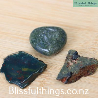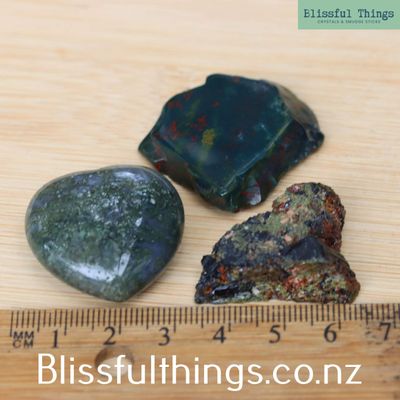 Each piece displays beautiful natural shades of green, from the soft moss-like inclusions within Moss Agate to the deeper tones of Bloodstone and the striking contrast of dark tourmaline crystals set within green epidote. Formed through different geological processes, these minerals show a variety of natural patterns, textures, and crystal structures that make each piece unique.