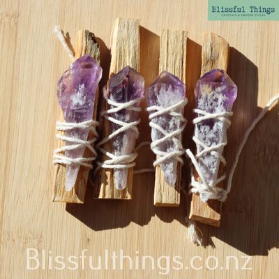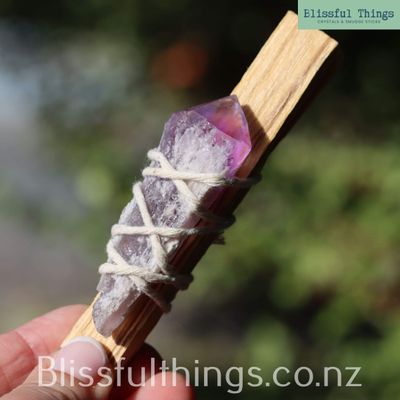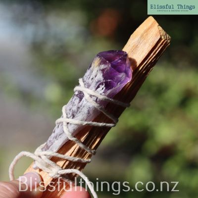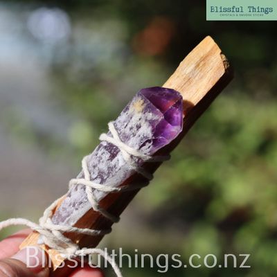 Carefully bound with soft white cotton string, each piece is thoughtfully created to support both energetic cleansing and spiritual connection. Palo Santo has long been used for clearing stagnant energy, inviting in calm, and creating a grounded, peaceful space. Paired with Bahia Amethyst, known for its striking natural formation and strong intuitive properties, this combination uplifts, protects, and enhances clarity.