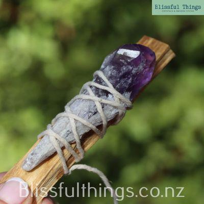 This thoughtfully created trio combines the cleansing power of Palo Santo with three beautiful and complementary stones—Bahia Amethyst Dragon Tooth, Pyrite, and Satin Spar.