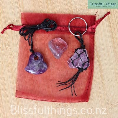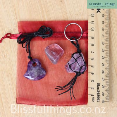 This beautiful Amethyst Gift Bundle includes an Amethyst Bound Key Ring, an Amethyst Heart Pendant and an Amethyst Tumble Polished Stone, thoughtfully presented in a soft organza bag.