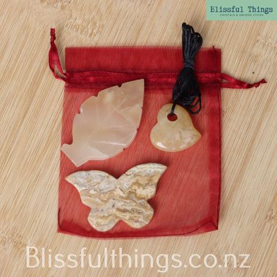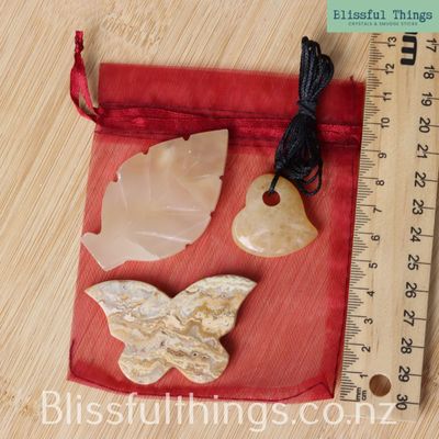 This beautiful Gift Bundle includes a Yellow Crazy Lace Agate Butterfly, a Yellow Calcite Leaf, and a Yellow Agate Heart Pendant, thoughtfully presented in a soft organza bag.