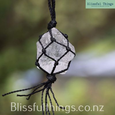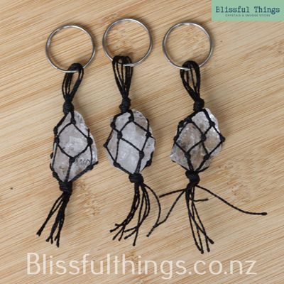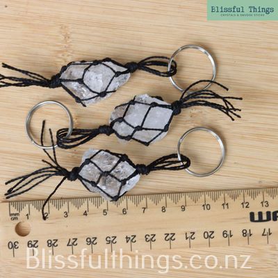 Raw Clear Quartz keyring, bound with black cord and featuring a silver keyring holder.