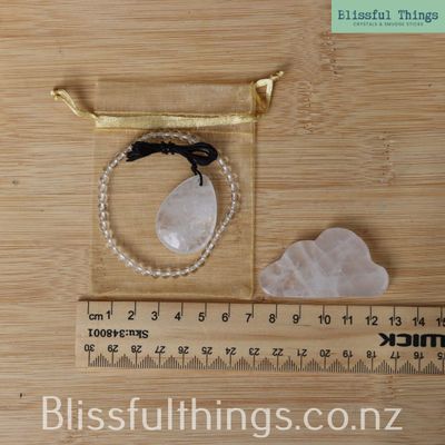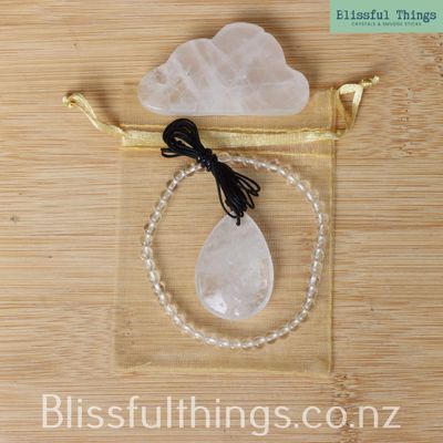 This beautiful Quartz Gift Bundle includes a Quartz Tear Drop Pendant, a Quartz Cloud, and a Quartz 4mm round Bead Bracelet, thoughtfully presented in a soft organza bag.